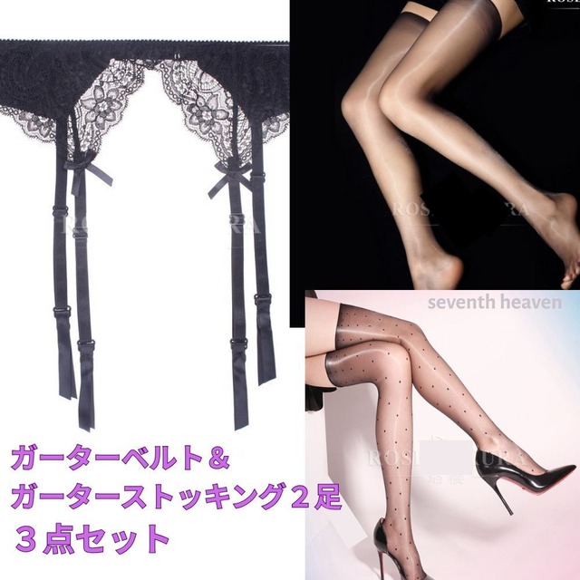 当店おすすめRoseSakuraシリーズの ガーターベルトとストッキングのセット商品です。 シンプルなレース素材のガーターベルト1枚と 1デニールのガーターストッキング2足の お得な3点セットです。 ガーターベルトはベーシックなデザイン。 華奢なデザインとしっとりした肌触りが魅力です。 ウエストはバックのアジャスターで調節可能です。 サイズ目安はウエスト約55cm~約68cm。 ガーターストッキング2種類 1足は美しい光沢感とシンプルなデザイン もう1足はカジュアルなドット柄デザイン どちらも1デニールの超薄素材です。 着用時の伝線を避けるための ポリエチレン手袋2双を同封します。 (あくまでおまけであり、100%伝線を防げるものではありません。) ※商品の画像と実際の商品は若干、色に違いがある場合がございます。 ご了承ください。 商品番号:GST03